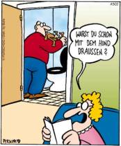 Erziehung ist ein wichtiges Element im heutigen Leben. Man kann nie genug früh damit anfangen. Dabei spielt es keine Rolle, ob es sich um Hunde, Kinder oder sogar Ehepartner handelt. Nur stellen Ehepartner meist die grössten Probleme dar. Ein Mann verkauft seine Dogge. Nach ein paar Tagen ruft der neue Besitzer ihn an und sagt: "Ich habe vergessen, Sie zu fragen, ob der Hund kleine Kinder mag." "Slogan für eheliche Erziehung: Nööd luug lah gwünnt (Als Männerproblem rangiert immer noch das Bepissen des gemeinsamen Klodeckels auf Platz 1) |