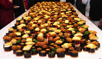 | Die Attraktion des mit Spannung erwarteten Abends war selbstredend, das von Peti zubereitete Abendessen. Dieser war gleich doppelt gestresst, hat ihn doch sein langjähriger Mitarbeiter wieder einmal kurzfristig im Arbeits-Schlamassel sitzen gelassen und dazu musste er neben dem Einkauf auch noch die Brötchen belegen, die Suppe kochen und den Tisch decken, dass er dabei die Suppenlöffel vergessen hat ist verständlich, sonst war das Essen perfekt; so dass wir fast einwenig enttäuscht waren. Die von Rita arrangierte Osterdekoration ging unter den Bergen von Canapés fast unter und die sichtbaren Sachen waren wie letztes Jahr im Nu gefressen, pardon gegessen.