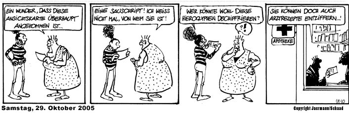 Selbstredend ist auch Dämpf zur gewohnten Zeit (21:30 Uhr, aber war das nun zu seiner Sommer- oder Winterzeit ?) eingenickt, allerdings nur auf dem Stuhl. Vorher musste er der freudenstrahlenden Irène 100 Franken geben. Er hat eine Wette verloren, da er behauptete, dass die Uhrzeit im Herbst um eine Stunde nach vorn, an Statt richtigerweise zurückgestellt wird. Ein richtiger Vita-Dauerbrenner. | ||||||||||||||