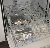 Alufolie und lässt den Geschirrspühler zwei Stunden laufen und schon ist eine warme Mahlzeit fertig.