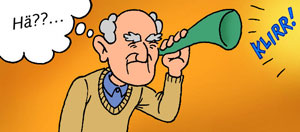 | Lieber eine Stumme im Bett als eine Taube auf dem Dach. Hansruedi, jetzt häsch aber au äs Probleme. Wie bringsch d'Irène ufs Dach? Vielleicht hat sie aber auch nur verstopfte Ohren und sollte sich mit Erika zusammen tun die auf die Ohrkerzen schwört. "Nun Oma, wie funktioniert das neue Hörgerät?" Der ältere Herr im Taxi erklärt dem Taxifahrer, nachdem er diesen nach der dritten Wiederholung eines Satzes immer noch nicht verstanden hat, wie schwer er es doch mit seiner Schwerhörigkeit hätte. |