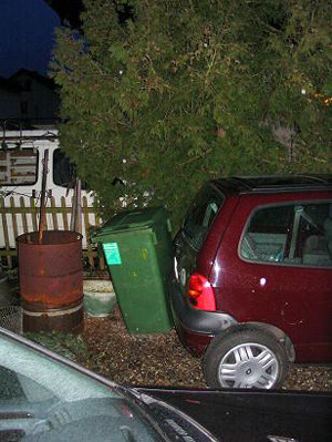 | Es ist schon wieder passiert. Letztes Jahr hat der Postbote mit seinem grossen Lieferwagen den dicken Betonpfosten von Buchers Gartenhag umgedrückt. Er hat gesagt: Ich habe nichts bemerkt, obwohl die Stossstange hinten lädiert war. Gestern nun, der fast gleiche Vorfall Ich habe nichts bemerkt, die gleiche Antwort. Wie auf dem Bild zu sehen ist, wurde eine Kamikaze-Attacke auf den Kompostkübel gefahren. Niemand hörte etwas. Gott sei Dank hat sich später ein Zeuge, ein später eintreffender Gast, gemeldet, der den schräg stehenden Container gesehen hat. Von einer Anzeige wegen Fahrerflucht wird abgesehen, da die Täterin sich reuig und Schadenersatzwillig zeigte. Schaden am Container: Null Schaden am Auto: Null Schlechtes Gewissen: Keines (Hat gar kein Gewissen) Nachforschungen haben ergeben: Der Hausherr fährt jede Woche mindestens ein Mal rückwärts in den Container. Hauis schwärmen vom Musical Ewigi Liebi. Irène hat mit Hansruedi schon zum zweimal den Film Slumdog Millionair gesehen |