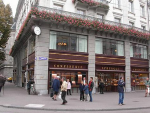 SPRÜNGLI, Bahnhofstrasse 21-Im Sprüngli-Restaurant im ersten Stock der Filiale am Paradeplatz bleibt der sauberste Teil der Überalterung hängen. Die Confiserie-Institution bedient einen adrett-greisen Schneckenstrom goldklimpernder