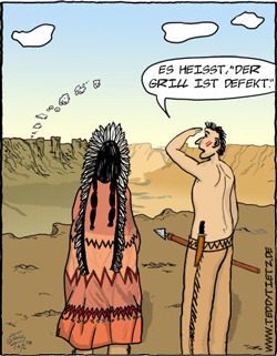 | Eines Tages fragen die Indianer ihren Häuptling, wie der nächste Winter wird. Er antwortet: 'Sehr lang und kalt! Sammelt Holz.' Sie sammeln Holz, der Winter kommt und ist ganz mild. Im nächsten Jahr fragen die Indianer wieder Ihren Häuptling, wie der Winter wird. Er antwortet: 'Sehr lang und kalt! Sammelt Holz.' Sie sammeln Holz und der Winter wird ganz mild. Das gleiche wiederholt sich auch im dritten Jahr. Im vierten Jahr haben sie die Nase voll. 'Unser Häuptling ist nicht weise genug, wir gehen jetzt zum weissen Mann. Der hat Meteorologen.' Gesagt, getan. 'Weisser Mann, wie wird der nächste Winter?' Er antwortet: 'Sehr lang und kalt.' Misstrauisch fragen die Indianer, woher er das wisse. Er antwortet: 'Ganz einfach, die Indianer sammeln schon drei Jahre lang wie verrückt Holz...' | |||||||||||||||