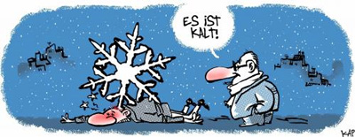 | Der Winter hält uns weiter in seinen eisigen Krallen. In Anbetracht der unsicheren Wetterlage hat Pauli seinen Bemühungen um abzunehmen eingestellt. Er befürchtet bei zu wenig Nahrungsaufnahme und sehr kalten Temperaturen einen Schwächeanfall zu erleiden . Dieses Risiko ist er kurz vor seinem Geburtstag nicht bereit einzugehen (Er wird sich nach dem Fest eine neue Ausrede ausdenken). | |||||||||||||||
