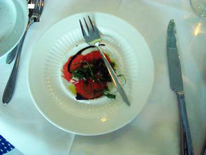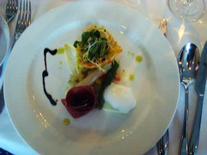 Ein Rindscarpaccio mit Parmesan auf Rucola wurde als Amuse-bouche gereicht, danach ein pochiertes Wachtelei auf Wasabischaum.