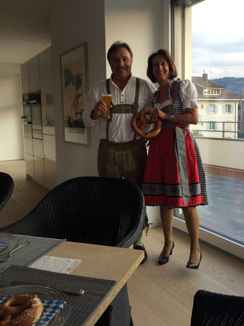 Irène liess sich vom inständigen Bitten der Vitaparcourer erweichen und offerierte eine g'standne Brotzeit mit allem Drum und Dran. Sogar ein Trachtenpaar aus dem südlichen Bayernland - in der Gegend von Bülach - konnte sie überreden am Parcours aufzutreten. Heidi wurde auch angefragt, da ihr Dirndl-Auftritt bei einem Trachtenfest auf der Hundwilerhöhe einigen in bleibender Erinnerung sei, sie fand leider das Kostüm erst nach dem Anlass, sagt sie.