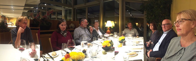 Dann waren's nur noch eine - Sylvia ist die letzte noch vor-AHV-arbeitende Dame im Vitaparcours. Seit September bezieht auch Rita ihre wohlverdiente Rente. Ihre erste Auszahlung hat sie für die Einladung ins Restaurant Orangerie im Hotel Engimatt verbraucht. Der Vita dankt der Spenderin für den angenehmen Abend. Der Anlass war richtig durchorganisiert, sogar eine Anzeige für die Familie Hauenstein war am Anschlagbrett zu sehen und jedem Teilnehmer wurde eine gedruckte Menu- und Weinkarte überreicht. Ein griechischer Oberkellner dirigierte die Kellner am Vita-Tisch, las den Damen und Herren Wünsche und anderes von den Augen ab und Peti hatte interessante Weine aus dem Hotel-Sortiment ausgesucht. Für die Zigarren-Fans war gar ein Fumoir eingerichtet, was selbstredend vor dem Käse ausprobiert wurde [Die Zigarren waren genau richtig, aus dem Humidor AdR]. Zufrieden an Leib und Seele verliessen wir das Lokal in den frühen (Vita-)Nachtstunden.