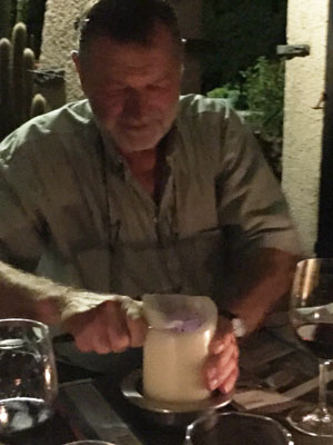 Auch sonst war er bei weitem der aktivste Mensch des Abends, er traktierte zusammen mit Heidi eine grosse Kerze, die nicht so richtig brennen wollte, mit Erfolg, wie zu vermelden ist.