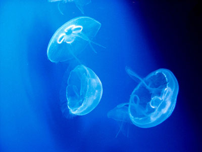 Quallen (rechts ein Bild vom Aquarium in Genua, von Heidi zur Verfügung gestellt) kommen in allen Wassern vor und bestehen zu über 90% aus Wassern. Sie sind ein Hauptnahrungmittel (sic!) der Thunfische, die vielleicht darum so schön schlank bleiben, eben stromlinienförmig, da die Fische wiederum durch die Menschen gefressen werden, können sich die Quallen umso besser vermehren. Aber nicht nur die Thunfische finden die Schlabbers köstlich, auch im asiatischen Raum werden diese als Spezialität sehr geschätzt.
