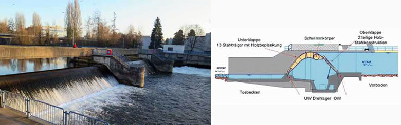Ein Dachwehr besteht dabei aus einer Unter- und einer Oberklappe, in der sich ein Schwimmkörper befindet. Bei ansteigendem Oberwasser richtet sich das Wehr auf. Die Höhe der Aufrichtung hängt davon ab, wie viel Wasser durch Steuerklappen am Rand des Wehres durchgelassen wird [Muss ganz schön heiss sein, dort wo der Chef schreibt...AdR]