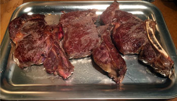 präsentierten Gerichten 12 Heidi Bilder 5 Landschaften und 3 Mal Schampi. Die Hierarchie wurde eingehalten. Wir kamen auch in den Genuss der Frankreichreise: zur Vorspeise gab es eine wunderbare Bouillabaisse und als Hauptgang Côte de boeuf , es gab nicht für jeden ein Stück, sondern nur 3 Stück, ca. 3 Kilo, wir mussten teilen. Ein Tip für Kaffeetrinker in Frankreich, ab besten trinkt man zum Frühstück Tee und während dem Tag einen Café serré, eigentlich einen doppelten Ristretto [Also, es entspricht etwa einem schweizerischer Expresso, in Italien beinahe einem Caffè lungo, er ist aber trinkbar im Unterschied zum normalen Café, ein leicht bräunliches, heissen Wasser AdR].