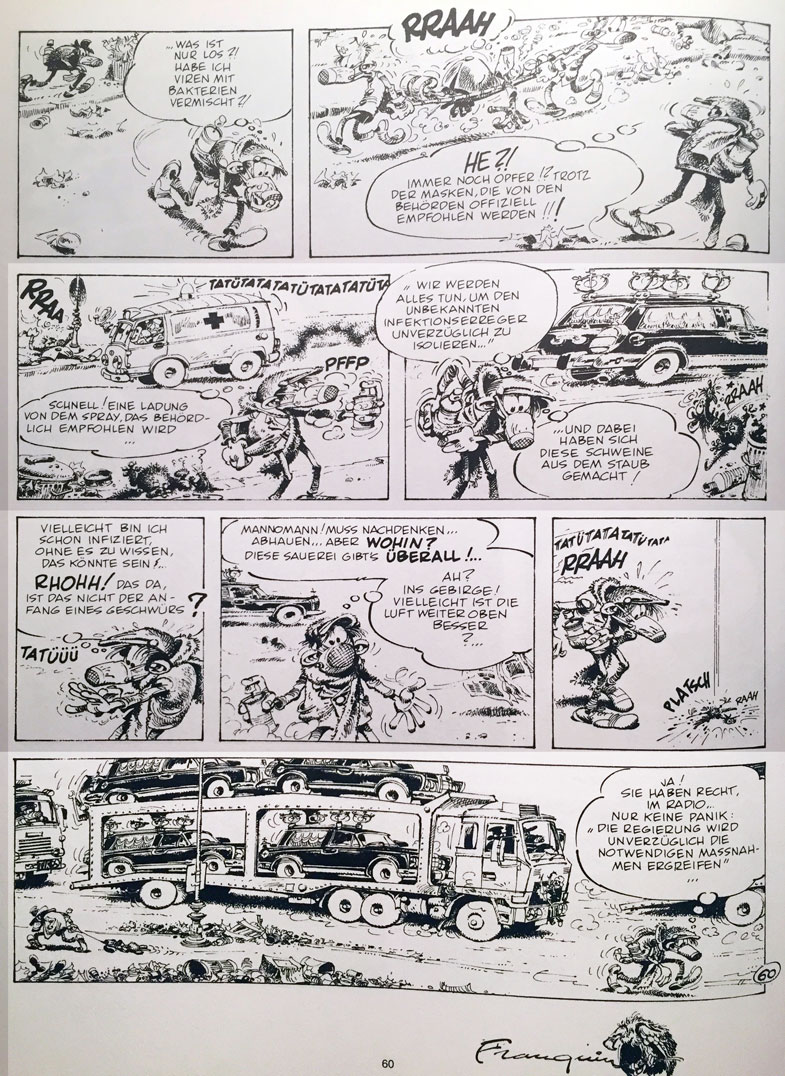 So, zum Schluss noch eine Seite aus den Idées noirs von André Franquin, ein begnadeter Comic-Zeichner aus Belgien. Marsupilami, Gaston, uva sind aus seiner Werkstatt.