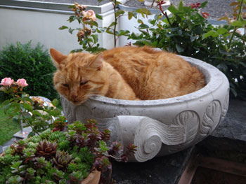 Auch diesmal dürfen wir über das Wetter nicht klagen, es war fast etwas unwirklich schön vor allem wenn man die Berichte über die Hochwasser in der Schweiz und anderswo im Gedächtnis hat. Wie immer wenn der Parcours bei Hauis im Freien stattfindet nahm Max den Vorsitz ein und blieb bis zum Schluss in seiner Vase liegen, da der Hauptgang vegetarisch war, musste er nicht einmal aufstehen um sich etwas vom Tisch zu erbetteln. Die zwei grossen Käsebretter locken halt keine Katze vom Ausssichtsplatz.