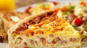 150 grs Auslegeteig, 50 grs geräucherter Brustspeck in dünnen Scheiben, 20 grs Butter, 50 grs Gruyères in dünnen Scheiben, 1 kleine in sehr fein geschnittene Zwiebel, 400 ml Rahm, 3 Eier, Salz, Pfeffer. - Teig ausrollen und eine 20 cm ø grosse Form legen - Speckscheiben 2 Minuten im kochenden Wasser entsalzen - In Butter leicht kross braten - mit den Käsescheiben abwechselnd auf den Teig legen -Zwiebel im Speckfett anziehen - Eier und Rahm schaumig schlagen und mit der Zwiebel mischen - Abschmecken und über den Speck und Käse leeren - 35 Minuten im gut heissen Ofen bei starker Unterhitze backen.