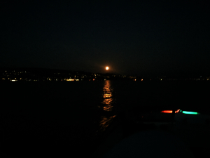 Wellen herumfuhr. Schampi hat nun sogar den Gedanken festgefasst, sich auch einmal auf so einem Ding zu probieren, muss ja nicht dieses Jahr sein... Das Abendessen im Restaurant Seerose auf der Terrasse war überaus spannend, trotz des netten Service war das Essen mehr teuer als gut, dafür waren dorten wirklich die Schönen (naturellement die Frauen, eher sommerlich leicht bis sonstwie offen gekleidet) und eben Bootsführer und Bezahler, die Reichen. Auf der Rückfahrt zum Heimathafen schien nochmals ein riesiger roter Vollmond über dem Wasser.