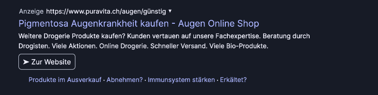 Und wirklich zum Schluss, noch den Schnappschuss aus dem Internet, wie sich Google sein Sackgeld aufbessert (harmlosere Variante, Sucheingabe: Retinopathia pigmentosa, eine Krankheit die zu Blindheit führt):