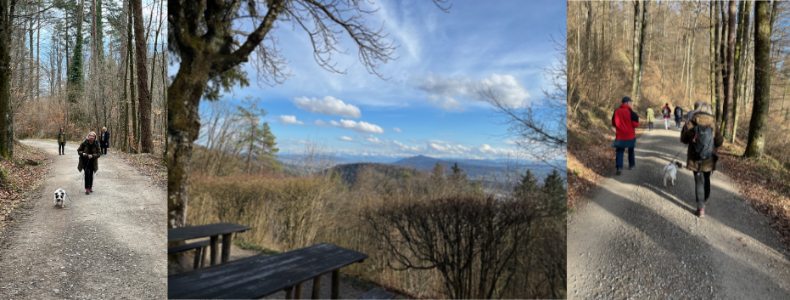 Wiederum war Irènens Altbergausflug auf den frühen Mittag abgemacht. nachdem die meisten Wetterprognosen eher Regen vorhersagte, ging man mit etwas Skepsis zum Treffpunkt, da die Strecke schon ohne Regen anstrengend war. Ausser einem frischen Lüftchen war nirgends eine grössere Luftfeuchtigkeit vorhanden, so dass man die Pelerine und den Regenschirm im Rucksack behalten konnte, es war sogar fast etwas frühlingshaft warm. Auch dieses Jahr war Snoopy - Heidis Ziehhündchen - dabei, so wanderte die Gruppe mit zügigen Schritten dem Mittagessen entgegen und traf unter dem Altberg-Turm auf die schnelle Sylvia, die schon etwas früher loszog, wohl mit grösserem Hunger. Auch begrüsste uns im Restaurant die bessere (Ersatz-)Mannschaft, wie schon im Vorjahr, auch der Knoblauch-Anteil soll wiederum wie im 2024 gewesen sein - alles für ein gutes Gelingen des Parcours-Anlasses.