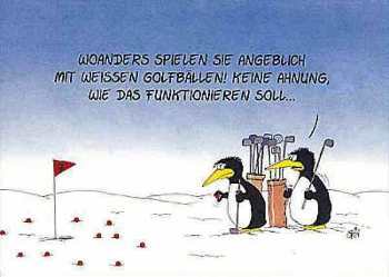 Weniger Glück hatte sie mit dem Wetter bei ihren Golf-Ferien mit Freunden in der Türkei, es war derart kühl, dass sie manchmal meinte Pinguine und Eisbären auf den Greens zu sehen, aber diese Sinnestäuschungen waren wohl eher ein Zeichen für einen akuten Salzmangel, wie ihr Pro sie beruhigen konnte. Die Einheimischen fügen dort ihrem Morgenkaffee immer etwas Salz zu [CTS - Café Turque Salé AdR], auch ist dort der traditionelle Morgengruss: Henüz tuzunu aldın mı? - Hast Du Dein Salz schon genommen? Der aufmerksame Pro [gibt es auch einen Contra? AdR] sammelte in allen Restaurants der Umgebung die Chips-