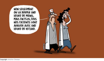 Die nebenstehende Karikatur von einer französischen Medizin-Webseite erinnert uns an die bevorstehende Zeit-Umstellung, die eigentlich schon vor Jahren in der EU abgeschafft hätte werden sollen, aber die Sitzungsgelder der EU-Kommission zur Abschaffung der Zeitumstellung fliessen dermassen üppig, dass keiner der Teilnehmer auf dieses verzichten will, und, was ist zur Zeit schon noch normal auf unserem Planeten?