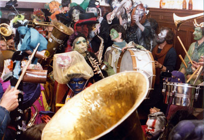 das grandiose Musikfestival. Während im Grossmünster, der Mundartschriftsteller Pedro Lenz eine hochdeutsche Predigt hielt wurde draussen mit viel Getöse der Winter ein erstes Mal vertrieben, auch Klimaerwärmung genannt. Anschliessend waren Rita und Peti mehrere Stunden in der wohl traditionellsten Carneval-Wirtschaft der Stadt, der Bodega, aber auch hier hat offenbar die gemanagte Moderne Einzug gehalten: Alle Gruppen mussten sich voranmelden um für ein paar Minuten Einlass zu erhalten und zwei oder drei Stücke zu spielen - vorbei die chaotischen Zeiten, wo mehrere Guggen das Lokal restlos ausfüllten und nicht nur sich selbst zum Wanken brachten. Schade, findet ein ehemaliger Fasnächtler.