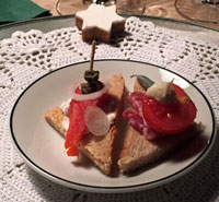 Nach dem Apéro zelebrierte Peti sein Amusebouche auf derart professionelle Weise, dass einerseits der Verdacht besteht, er habe heimlich ein paar Wochen auf Schloss Schauenstein bei Herrn Caminada gelernt, und andererseits die Gruppe etwas Angst bekam, dass der Monolog bis Mitternacht andauert und die Zuhörer Hungers sterben würden. Was aber nicht der Fall war. In rascher Folge (wie bei Caminada) wurden die Vorspeise, der Hauptgang, Käsegang und das Dessert aufgetragen. Für ein